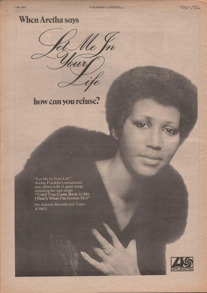 ARETHA FRANKLIN Poster size Let me in your life LP advert 1974. Original Newspaper Print - Vg+ condition. Size A3 Approx 16" X 12" (42 X 30cm)