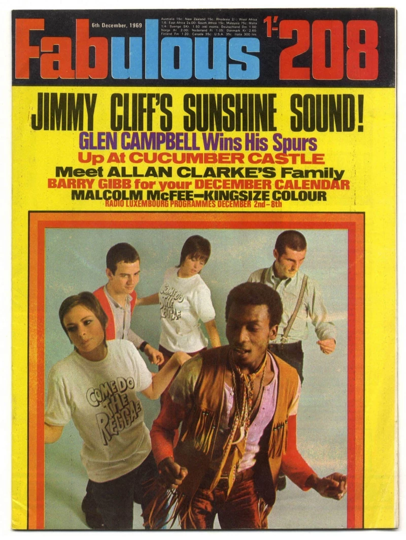 Fabulous 208 Magazine 6 December 1969 Jimmy Cliff Don Powell & Jim Lea of Slade on the Cover. Jimmy Cliff near 2 page article; Slade approx full page article; Allan Clarke of the Hollies pinup and article; Bee Gees 2 page article and Barry Gibb poster.