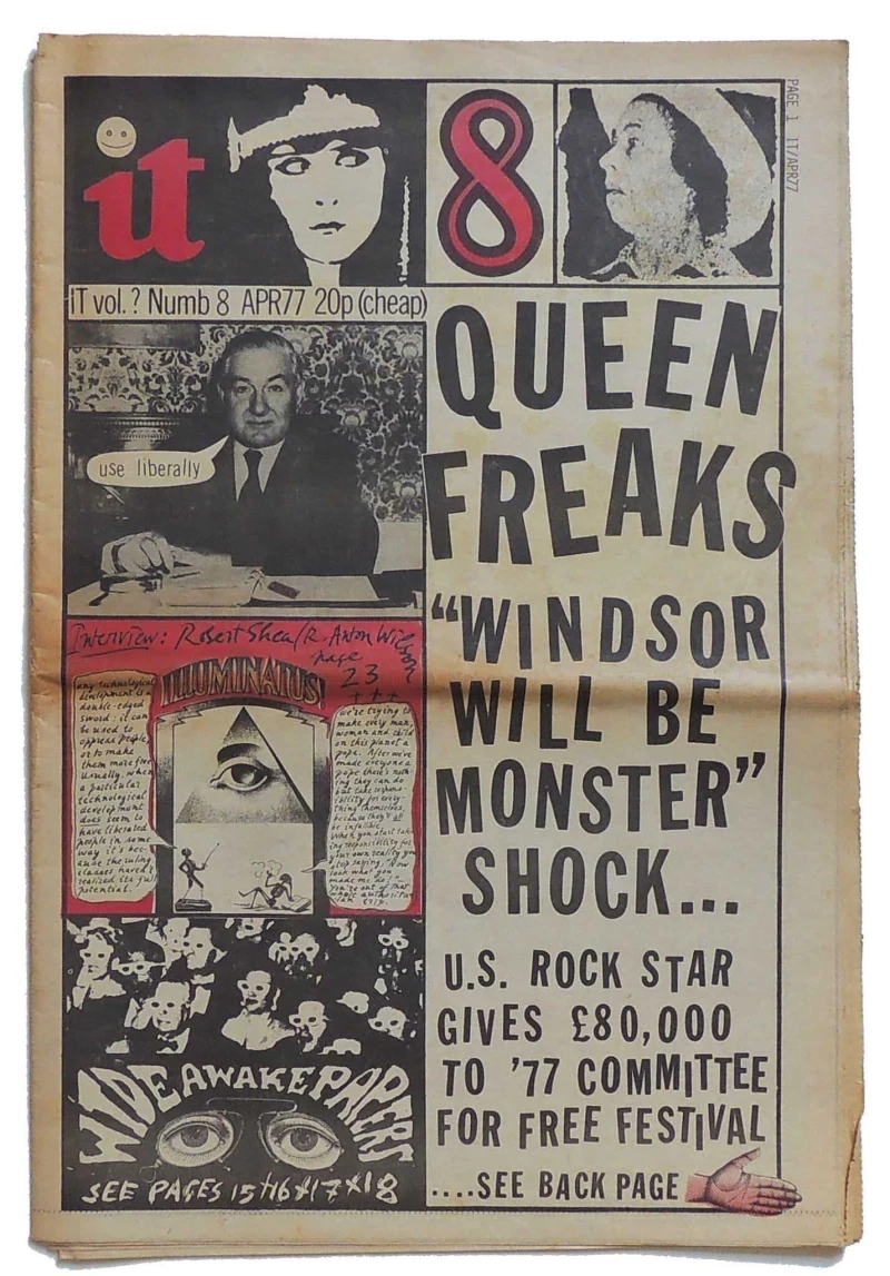 International Times it Vol? 1977 No 8 April: Queen Freaks: Windsor Will Be A Monster, Shock; Robert Shea & Robert Anton Wilson interviewed re. Illuminatus! Wide Awake Papers; John Meaker, IT artist extraordinaire; pages of The Gemstone File as graphic novel; Biff - Interstellar Dave On The Oblivion Express; Rock & Roll Madness Jay Jeff Jones