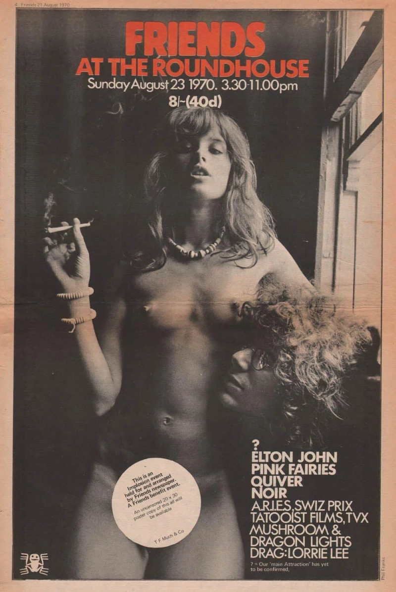 • FRIENDS AT THE ROUNDHOUSE Pink Fairies Elton John QUIVER NOIR. Great shot of Uschi Obermaier. Poster size Advert 1970. Original Newspaper Print - Vg condition. Size A3 Approx 16" X 12" (42 X 30cm).