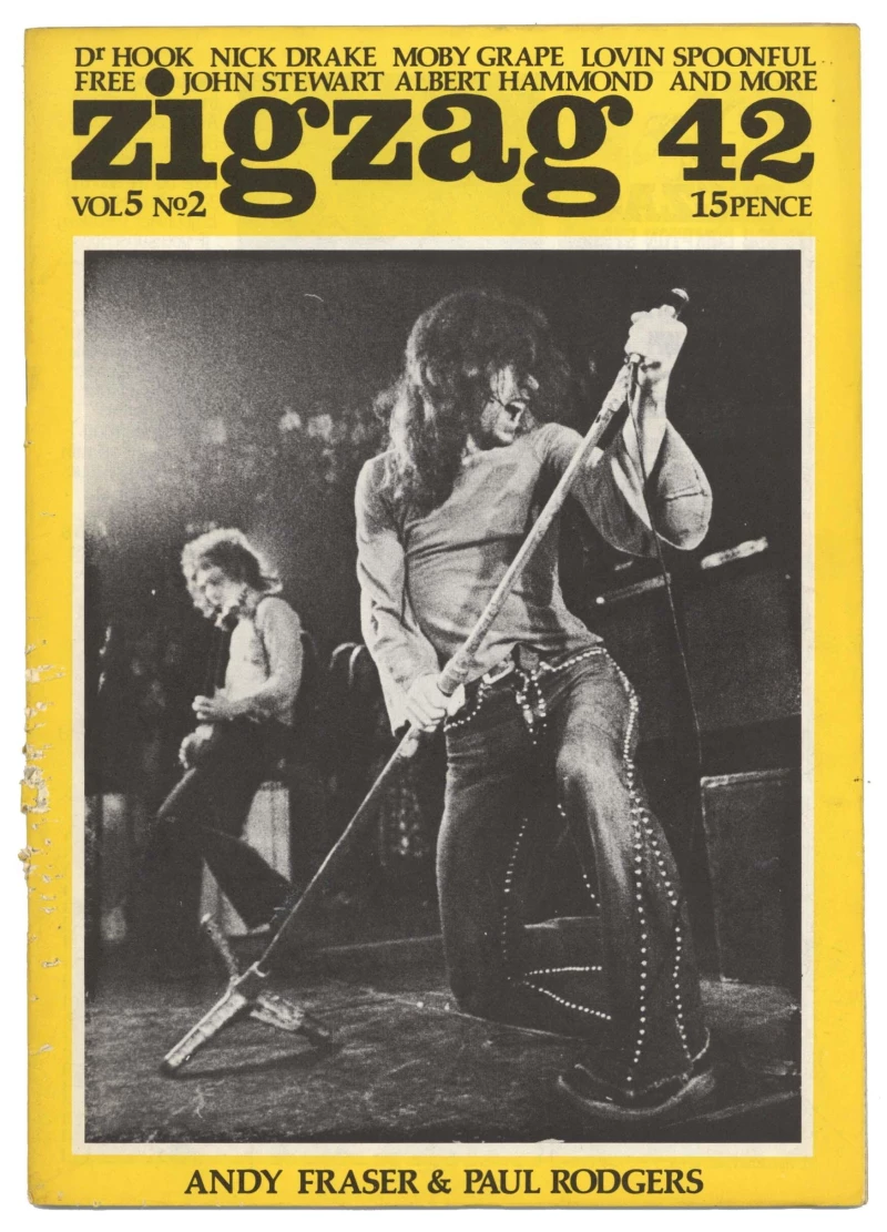 Original UK Zigzag Magazine Vol 5 No. 2 June 1974. Andy Fraser and Paul Rogers of Free on front cover.