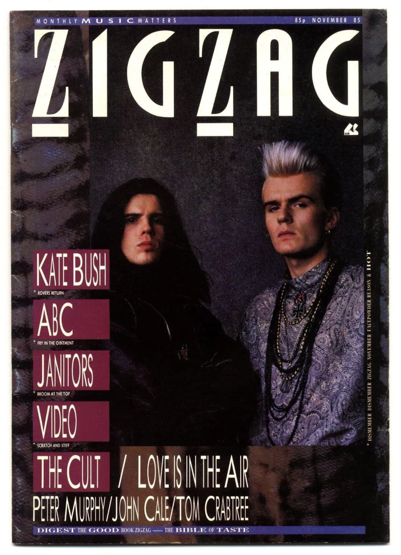 Zigzag Magazine No 168 November 1985 features Kate Bush interview; Jah Wobble full page article; John Cale full page; Echo & the Bunnymen article; Einsturzende Neubauten 2 page article; Peter Murphy 2 page article; Crime & the City Solution full page article; Janitors; ABC 2 pages; The Cult 4 page article; Eric Bogosian 2 page article.
